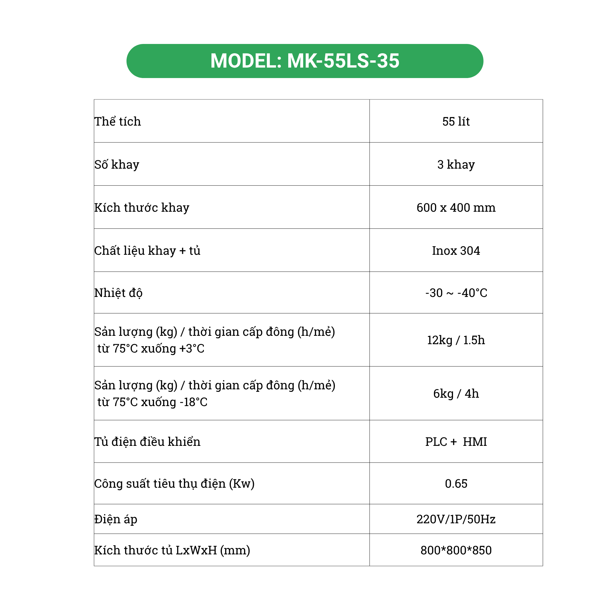 Cấp đông nhanh: Từ 75°C → -18°C trong 240 phút (hoặc nhanh hơn tùy loại sản phẩm).